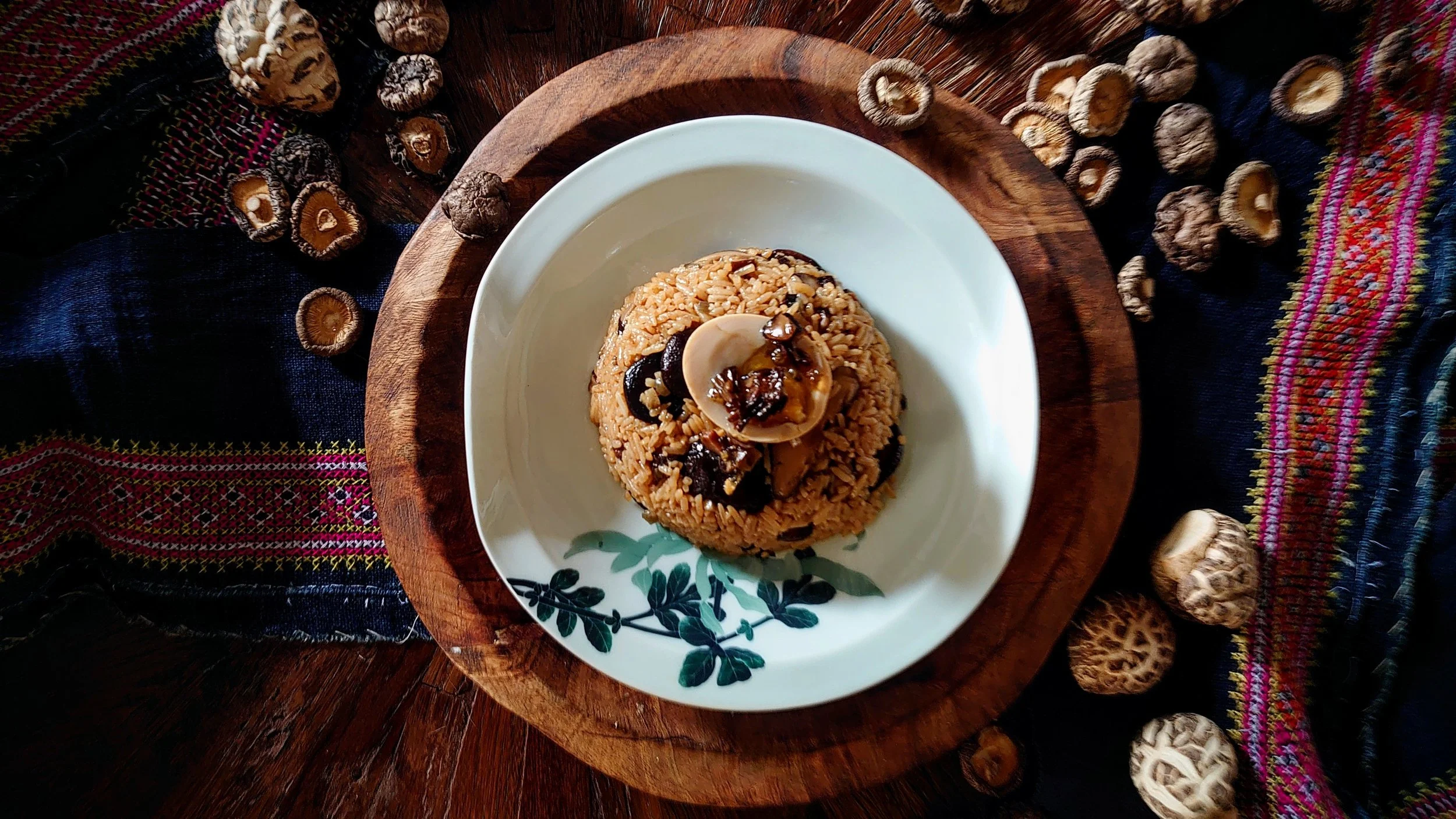Shiitake Rice (China) - A celebration of the most popular mushroom in the East, using 3 different kinds of Shiitakes for a variety of textures, topped with a marinated egg seasoned in shiitake soy sauce